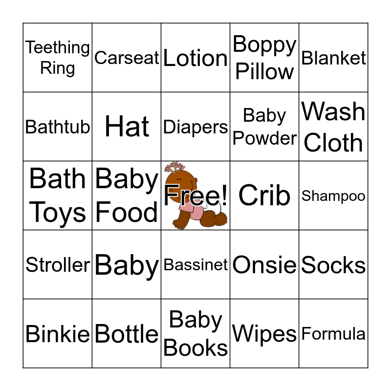 This bingo card has a free space and 24 words: Baby, Bottle, Diapers, Binkie, Blanket, Teething Ring, Bathtub, Carseat, Crib, Bassinet, Baby Powder, Bath Toys, Onsie, Socks, Hat, Wipes, Shampoo, Lotion, Wash Cloth, Baby Food, Formula, Stroller, Boppy Pillow and Baby Books.