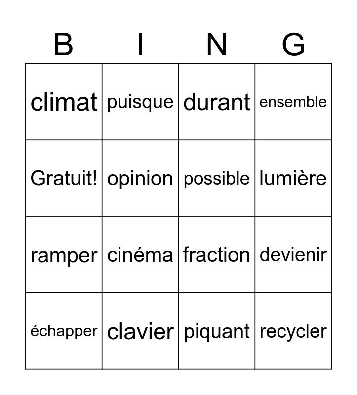This bingo card has 16 words: clavier, devienir, durant, climat, ramper, puisque, fraction, piquant, Gratuit!, opinion, échapper, ensemble, cinéma, lumière, possible and recycler.
