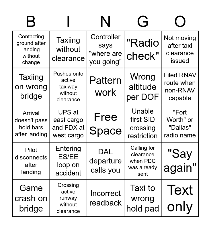 This bingo card has a free space and 49 words: Not squawking mode C, Text only, Calling for push in non-movement area, Incorrect readback, Entering ES/EE loop on accident, Squawking wrong code, Taxiing without clearance, Flying to wrong RNAV fix, Taxiing on wrong bridge, Calling wrong departure frequency, Pushes onto active taxiway without clearance, "Radio check", "Say again", Calling for clearance when PDC was already sent, "SARAH" instead of "SPERA", "DPARK" or "GPARK" instead of "BPARK", Pattern work, Unable first SID crossing restriction, Not reading back RNAV fix, Not moving after taxi clearance issued, UPS at east cargo and FDX at west cargo, Taxi to wrong hold pad, Contacting ground after landing without change, Wrong altitude per DOF, Filed as /X, Filed RNAV route when non-RNAV capable, Game crash on bridge, Taking forever to exit runway after landing, DAL departure calls you, Pilot disconnects after landing, “With you”, Calling tower when still on ground frequency, Connecting as IATA code instead of ICAO code, Connecting on movement area, Crossing active runway without clearance, Requesting IFR to DAL, Pilot disconnects right after messing up, Departure calls tower after taking off, "Fort Worth" or "Dallas" radio name, Pilot calls far away from the airport, Departure calls with arrival ATIS, "What is the departure frequency" after taking off, "Over to the dark side", Hot Mic, Arrival doesn't pass hold bars after landing, Controller says "where are you going", Having the ATIS "on board", Stupid child and Progressive taxi.