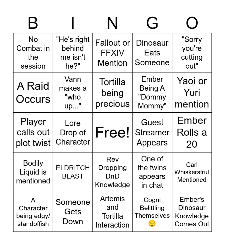 This bingo card has a free space and 24 words: ELDRITCH BLAST, Someone Gets Down, Tortilla being precious, A Character being edgy/ standoffish, "Sorry you're cutting out", No Combat in the session, A Raid Occurs, "He's right behind me isn't he?", Guest Streamer Appears, Rev Dropping DnD Knowledge, Ember Being A "Dommy Mommy", Player calls out plot twist, One of the twins appears in chat, Carl Whiskerstrut Mentioned, Vann makes a "who up...", Cogni Belittling Themselves 😔, Ember Rolls a 20, Fallout or FFXIV Mention, Yaoi or Yuri mention, Lore Drop of Character, Ember's Dinosaur Knowledge Comes Out, Bodily Liquid is mentioned, Dinosaur Eats Someone and Artemis and Tortilla Interaction.