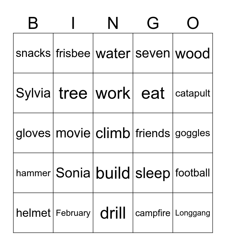 This bingo card has a free space and 29 words: helmet, camp, movie, cabin, snacks, water, tree, Sonia, friends, February, goggles, Longgang, drill, campfire, catapult, introductions, build, hammer, wood, gloves, sleep, throw, eat, Sylvia, seven, frisbee, football, work and Paul.