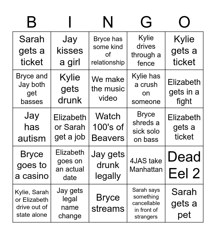 This bingo card has a free space and 24 words: Elizabeth goes on an actual date, Jay gets legal name change, We make the music video, Kylie, Sarah or Elizabeth drive out of state alone, Kylie gets a ticket, Sarah gets a ticket, Bryce and Jay both get basses, Jay kisses a girl, Bryce shreds a sick solo on bass, Jay gets drunk legally, Kylie has a crush on someone, Jay has autism, 4JAS take Manhattan, Dead Eel 2, Kylie gets drunk, Sarah says something cancellable in front of strangers, Elizabeth gets a ticket, Bryce has some kind of relationship, Elizabeth gets in a fight, Elizabeth or Sarah get a job, Sarah gets a pet, Bryce goes to a casino, Kylie drives through a fence and Bryce streams.