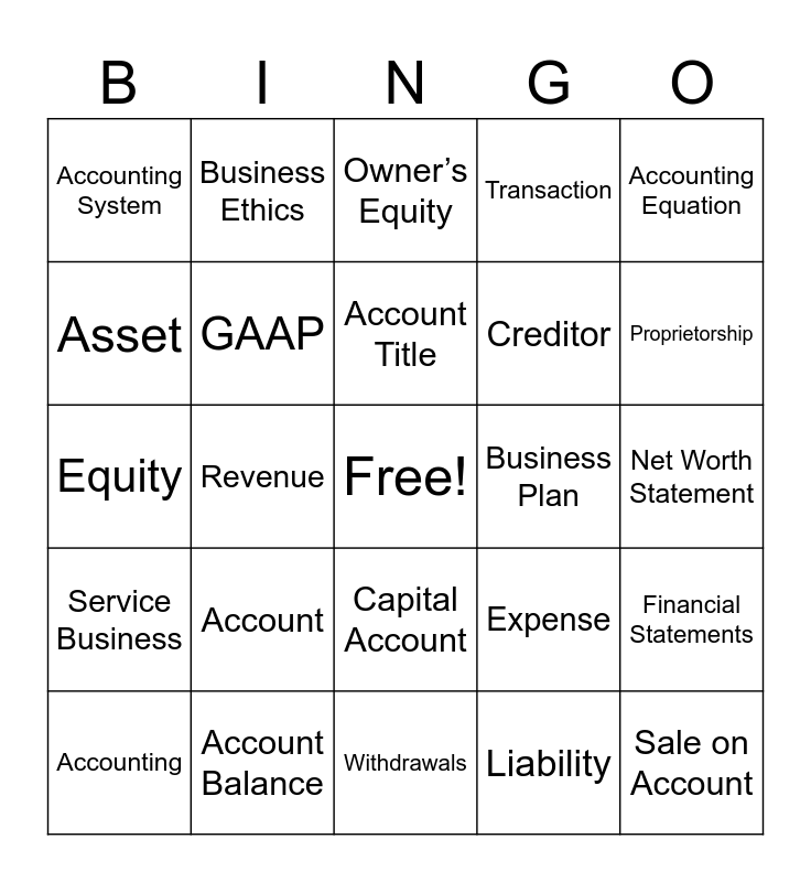 This bingo card has a free space and 24 words: Account, Account Balance, Account Title, Accounting, Accounting Equation, Accounting System, Asset, Business Ethics, Business Plan, Capital Account, Creditor, Equity, Expense, Financial Statements, GAAP, Liability, Net Worth Statement, Owner’s Equity, Proprietorship, Revenue, Sale on Account, Service Business, Transaction and Withdrawals.