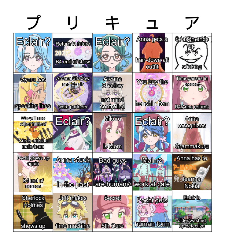 This bingo card has 24 images, a free space and 24 words: Anna stuck in the past, Jett makes time machine, Arcana Shadow not mind controlled, Sherlock Holmes shows up, Season ends up sucking, Eclair?, Gyaru has speaking lines, Return to future B4 end of show, Eclair?, Bad guys are humans, You buy the henshin item, We will see other fairies/ Cures outside main team, Main 2 work at cafe, Anna has to learn a Nokia, Arcana Shadow and Eclair were partners, Pochi gets human form, Anna recognizes Grammakuru, Eclair?, Time passes in present B4 Anna returns, Eclair?, Eclair is older/washed up detective, Pochi grows up again B4 end of season, Anna gets a hair-down alt outfit and Secret 5th Cure.