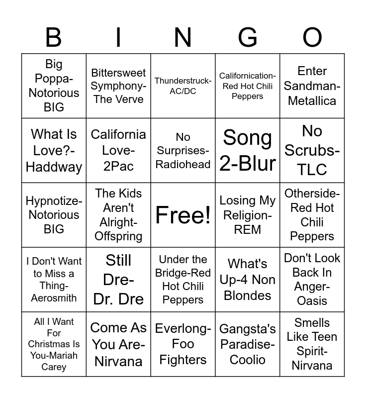 This bingo card has a free space and 43 words: Iris-Goo Goo Dolls, Smells Like Teen Spirit-Nirvana, Creep-Radiohead, All I Want For Christmas Is You-Mariah Carey, Wonderwall-Oasis, Gangsta's Paradise-Coolio, Thunderstruck-AC/DC, I Want It That Way-Backstreet Boys, Enter Sandman-Metallica, Come As You Are-Nirvana, Californication- Red Hot Chili Peppers, Losing My Religion-REM, Under the Bridge-Red Hot Chili Peppers, Still Dre- Dr. Dre, Zombie-Cranberries, Everlong-Foo Fighters, Nothing Else Matters-Metallica, Hypnotize-Notorious BIG, It Was a Good Day-Ice Cube, No Scrubs-TLC, Bittersweet Symphony-The Verve, All the Small Things-Blink 182, Basket Case-Green Day, Big Poppa-Notorious BIG, Scar Tissue-Red Hot Chili Peppers, Otherside-Red Hot Chili Peppers, Wannabe-Spice Girls, All Star-Smash Mouth, What's Up-4 Non Blondes, I Don't Want to Miss a Thing-Aerosmith, The Next Episode-Dr. Dre, Don't Look Back In Anger-Oasis, Kiss Me-Sixpence the Richer, The Kids Aren't Alright-Offspring, Baby One More Time-Britney Spears, November Rain-Guns and Roses, Linger-Cranberries, No Surprises-Radiohead, What Is Love?-Haddway, Song 2-Blur, Say My Name-Destiny's Child, California Love-2Pac and Torn-Natalie Imbruglia.
