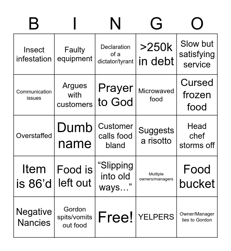 This bingo card has 31 words: Free!, Family owned, Dumb name, Dated/tacky decor, Insect infestation, Declaration of a dictator/tyrant, Argues with customers, Multiple owners/managers, Suggests a risotto, YELPERS, Head chef storms off, Customer calls food bland, Owner/Manager lies to Gordon, IT’S RAW, Cursed frozen food, Non-refrigerated food, Food bucket, Food is left out, Item is 86’d, “Slipping into old ways…”, Slow but satisfying service, Leadership issues, Negative Nancies, Faulty equipment, Microwaved food, Communication issues, >250k in debt, Overstaffed, Gordon spits/vomits out food, Prayer to God and Server shows schadenfreude.