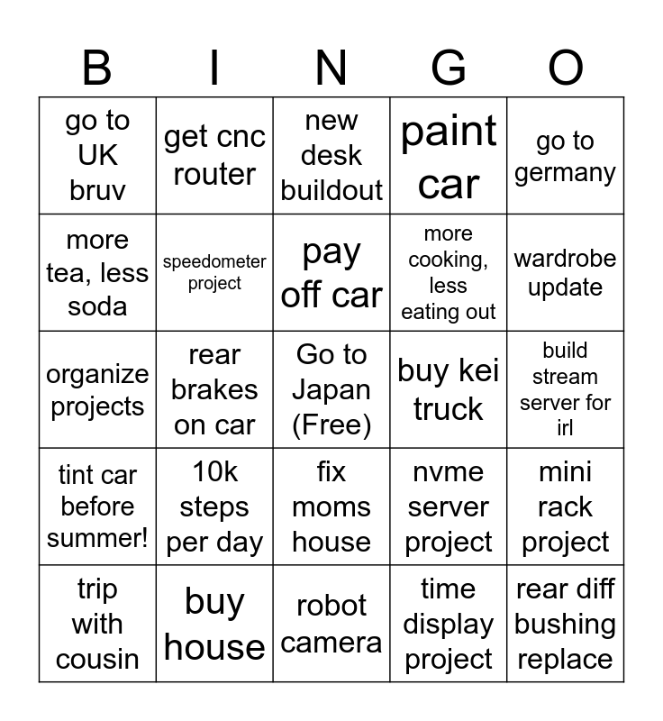 This bingo card has a free space and 24 words: 10k steps per day, buy house, pay off car, trip with cousin, go to germany, go to UK bruv, more tea, less soda, get cnc router, buy kei truck, fix moms house, more cooking, less eating out, organize projects, nvme server project, mini rack project, speedometer project, time display project, build stream server for irl, new desk buildout, wardrobe update, rear brakes on car, rear diff bushing replace, tint car before summer!, paint car and robot camera.