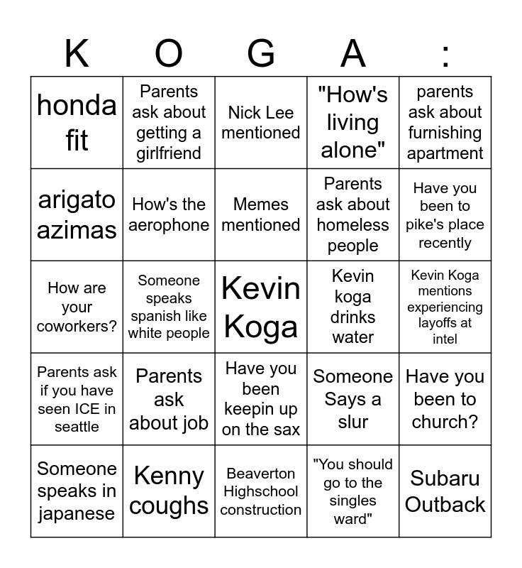 This bingo card has a free space and 24 words: Parents ask about job, Kenny coughs, Memes mentioned, Someone speaks in japanese, parents ask about furnishing apartment, honda fit, arigato azimas, Parents ask about getting a girlfriend, Kevin koga drinks water, Have you been keepin up on the sax, Parents ask about homeless people, How are your coworkers?, Someone Says a slur, Have you been to church?, How's the aerophone, "You should go to the singles ward", Kevin Koga mentions experiencing layoffs at intel, Nick Lee mentioned, Have you been to pike's place recently, Someone speaks spanish like white people, Subaru Outback, Parents ask if you have seen ICE in seattle, "How's living alone" and Beaverton Highschool construction.