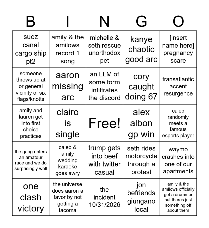 This bingo card has a free space and 24 words: caleb & amily wedding karaoke goes awry, the universe does aaron a favor by not getting a tacoma, an LLM of some form infiltrates the discord, one clash victory, [insert name here] pregnancy scare, suez canal cargo ship pt2, someone throws up at or general vicinity of six flags/knotts, amily & the amilows record 1 song, alex albon gp win, trump gets into beef with twitter casual, cory caught doing 67, amily and lauren get into first choice practices, seth rides motorcycle through a protest, waymo crashes into one of our apartments, aaron missing arc, jon befriends giungano local, caleb randomly meets a famous esports player, michelle & seth rescue unorthodox pet, transatlantic accent resurgence, clairo is single, amily & the amilows officially get a drummer but theres just something off about them, the gang enters an amateur race and we do surprisingly well, kanye chaotic good arc and the incident 10/31/2026.