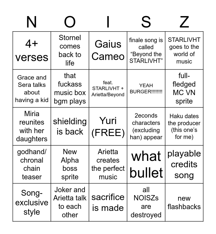 This bingo card has a free space and 24 words: New Alpha boss sprite, Joker and Arietta talk to each other, feat. STARLIVHT + Arietta/Beyond, Song-exclusive style, STARLIVHT goes to the world of music, 4+ verses, Grace and Sera talks about having a kid, Stornel comes back to life, 2econds characters (excluding han) appear, Arietta creates the perfect music, YEAH BURGER!!!!!!!!, Miria reunites with her daughters, what bullet, playable credits song, that fuckass music box bgm plays, all NOISZs are destroyed, Haku dates the producer (this one’s for me), Gaius Cameo, full-fledged MC VN sprite, shielding is back, new flashbacks, godhand/ chronal chain teaser, finale song is called “Beyond the STARLIVHT” and sacrifice is made.