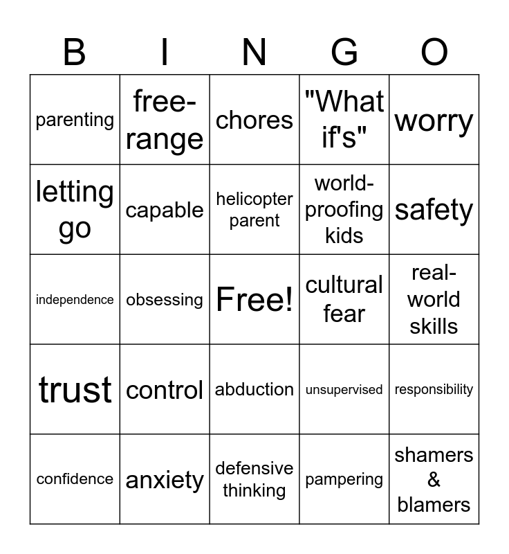 This bingo card has a free space and 24 words: control, anxiety, helicopter parent, confidence, worry, parenting, letting go, free- range, cultural fear, abduction, world-proofing kids, independence, unsupervised, responsibility, capable, pampering, real-world skills, chores, safety, obsessing, shamers & blamers, trust, "What if's" and defensive thinking.
