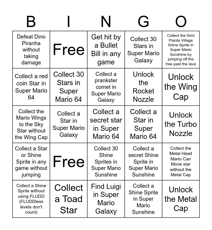 This bingo card has 35 words: Defeat Bowser in Super Mario 64, Defeat Bowser in Super Mario Sunshine, Defeat Bowser in Super Mario Galaxy, Collect 30 Stars in Super Mario 64, Collect 30 Shine Sprites in Super Mario Sunshine, Collect 30 Stars in Super Mario Galaxy, Collect a red coin Star in Super Mario 64, Collect a red coin Shine Sprite in Super Mario Sunshine, Collect a prankster comet in Super Mario Galaxy, Jump from the first planet of the Megaleg level straight to the boss arena, Collect the Mario Wings to the Sky Star without the Wing Cap, Collect the third Pianta Village Shine Sprite in Super Mario Sunshine by jumping off the tree past the lava, Defeat Petey Piranha without taking damage, Defeat King Bob-omb without taking damage, Defeat Dino Piranha without taking damage, Collect a Star in Super Mario 64, Collect a Shine Sprite in Super Mario Sunshine, Collect a Star in Super Mario Galaxy, Collect a Star or Shine Sprite in any game without jumping, Collect a secret star in Super Mario 64, Collect a secret Shine Sprite in Super Mario Sunshine, Collect a Shine Sprite without using FLUDD (FLUDDless levels don't count), Collect the Metal Head Mario Can Move star without the Metal Cap, Collect a Toad Star, Get hit by a Bullet Bill in any game, Unlock the Wing Cap, Unlock the Metal Cap, Unlock the Vanish Cap, Unlock the Rocket Nozzle, Unlock the Turbo Nozzle, Collect a Star in Super Mario Galaxy without motion controls or spin, Find Luigi in Super Mario Galaxy, Free, Free and Free.