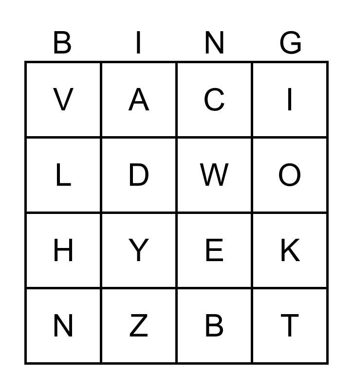 This bingo card has 16 words: Z, K, C, V, H, A, E, B, L, D, N, I, Y, O, W and T.