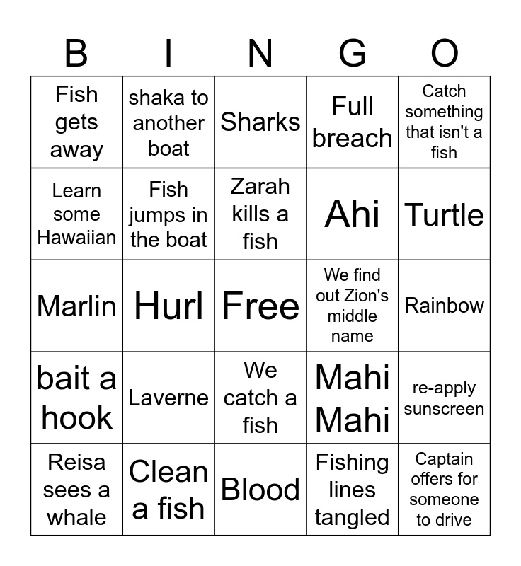 This bingo card has a free space and 29 words: Reisa sees a whale, Gaff Hook, Hurl, Dolphins, Fish gets away, Sharks, Fish jumps in the boat, Laverne, We find out Zion's middle name, Clean a fish, Rainbow, Captain offers for someone to drive, Blood, Fishing lines tangled, Turtle, need to pee, We catch a fish, bait a hook, Catch something that isn't a fish, Marlin, Mahi Mahi, Ono, Ahi, Learn some Hawaiian, Full breach, shaka to another boat, re-apply sunscreen, Zarah kills a fish and Family photo.