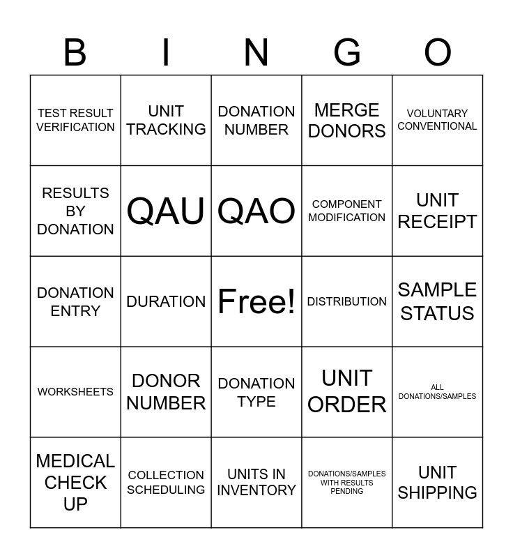 This bingo card has a free space and 24 words: DONOR NUMBER, COLLECTION SCHEDULING, QAO, MEDICAL CHECK UP, VOLUNTARY CONVENTIONAL, TEST RESULT VERIFICATION, RESULTS BY DONATION, UNIT TRACKING, DISTRIBUTION, DONATION TYPE, COMPONENT MODIFICATION, DONATION ENTRY, UNIT ORDER, ALL DONATIONS/SAMPLES, QAU, DONATIONS/SAMPLES WITH RESULTS PENDING, SAMPLE STATUS, DONATION NUMBER, UNIT RECEIPT, DURATION, UNIT SHIPPING, WORKSHEETS, MERGE DONORS and UNITS IN INVENTORY.