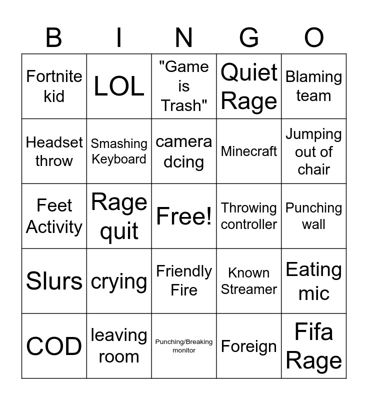This bingo card has a free space and 24 words: crying, leaving room, camera dcing, COD, Blaming team, Fortnite kid, Headset throw, LOL, Throwing controller, Friendly Fire, Minecraft, Feet Activity, Known Streamer, Eating mic, Smashing Keyboard, Foreign, Punching wall, "Game is Trash", Jumping out of chair, Rage quit, Fifa Rage, Slurs, Quiet Rage and Punching/Breaking monitor.