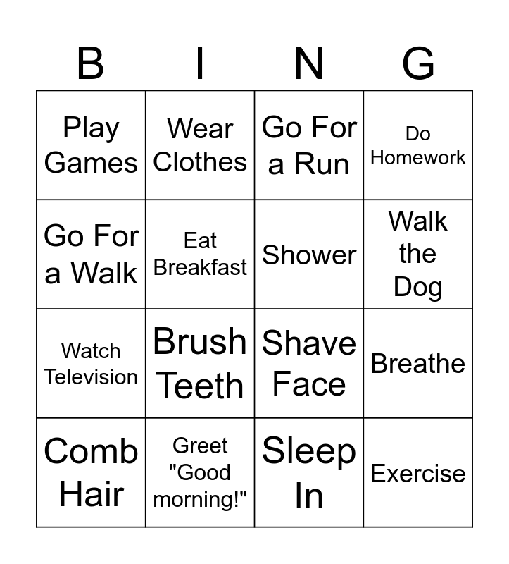 This bingo card has 16 words: Greet "Good morning!", Breathe, Go For a Run, Play Games, Watch Television, Wear Clothes, Shave Face, Sleep In, Go For a Walk, Eat Breakfast, Comb Hair, Do Homework, Brush Teeth, Walk the Dog, Shower and Exercise.
