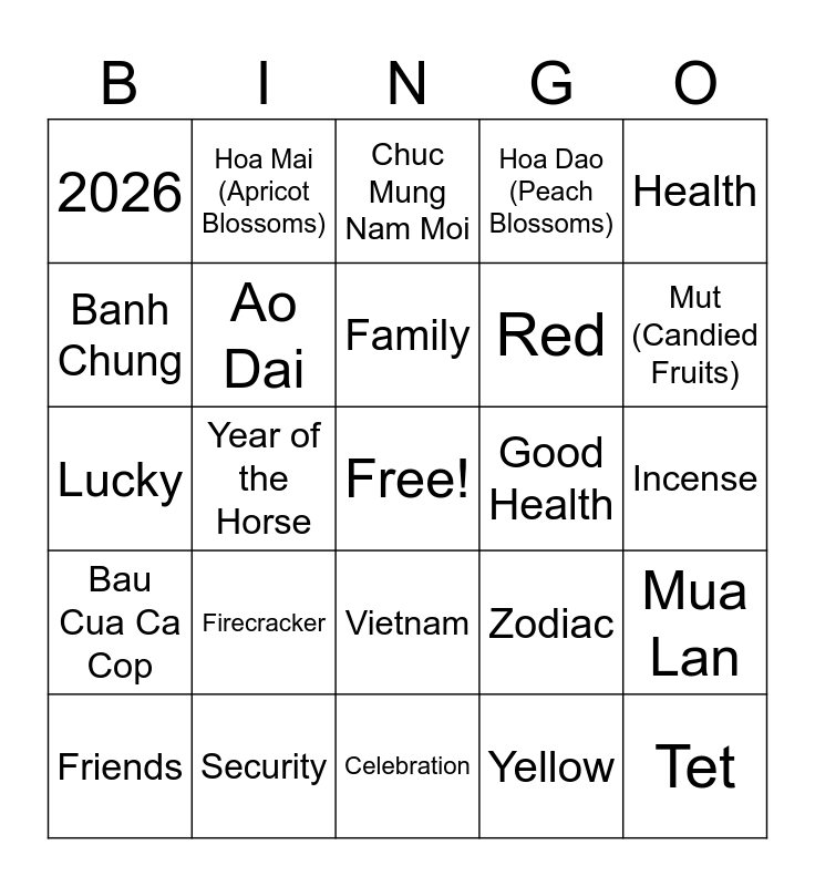 This bingo card has a free space and 28 words: Mua Lan, Banh Tet, Red, Yellow, Banh Chung, Chuc Mung Nam Moi, Hoa Mai (Apricot Blossoms), Bau Cua Ca Cop, Good Health, Friends, Lucky, Hoa Dao (Peach Blossoms), Security, Celebration, Mut (Candied Fruits), Li Xi, Firecracker, Ao Dai, Family, Vietnam, 2026, Prosperity, Tet, Year of the Horse, Incense, Zodiac, Health and Happiness.