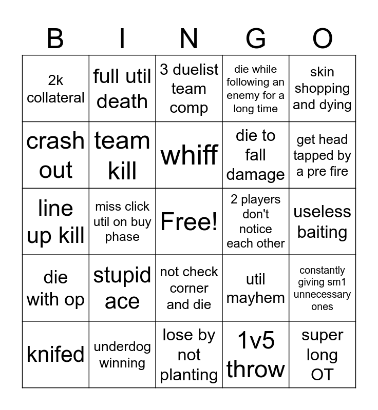 This bingo card has a free space and 24 words: knifed, stupid ace, whiff, 1v5 throw, skin shopping and dying, 2k collateral, full util death, 3 duelist team comp, 2 players don't notice each other, useless baiting, line up kill, team kill, util mayhem, constantly giving sm1 unnecessary ones, crash out, underdog winning, lose by not planting, die while following an enemy for a long time, get head tapped by a pre fire, die with op, miss click util on buy phase, not check corner and die, die to fall damage and super long OT.