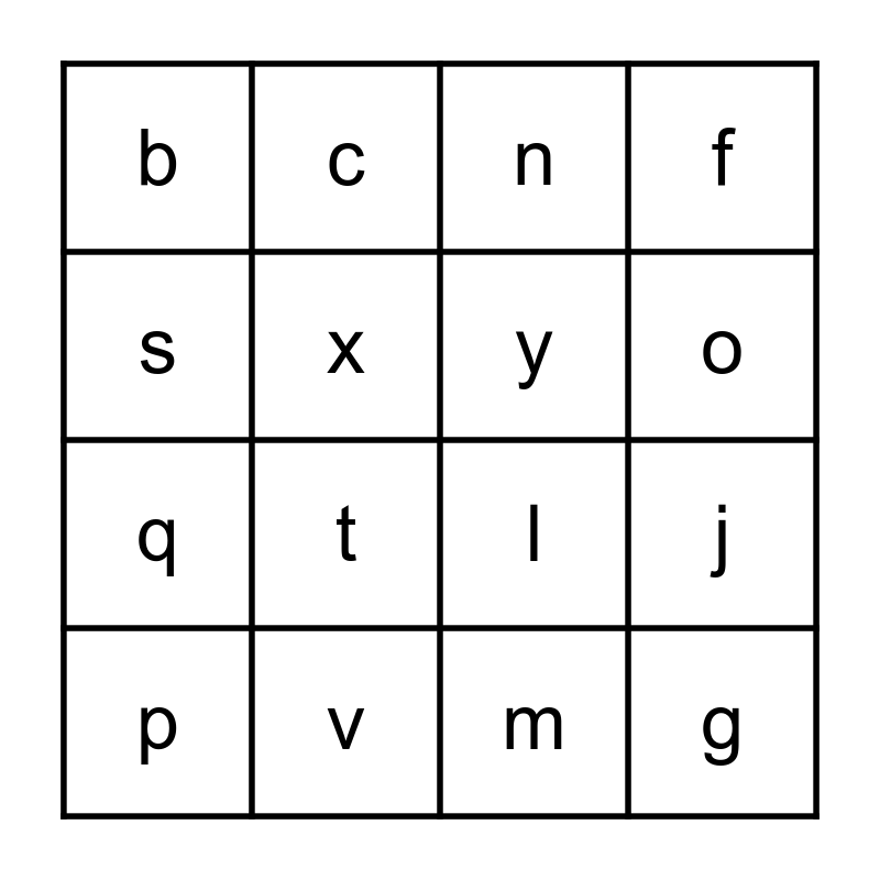 This bingo card has 26 words: a, d, o, k, s, b, x, c, m, i, q, l, e, h, j, r, f, g, n, p, t, u, v, w, y and z.