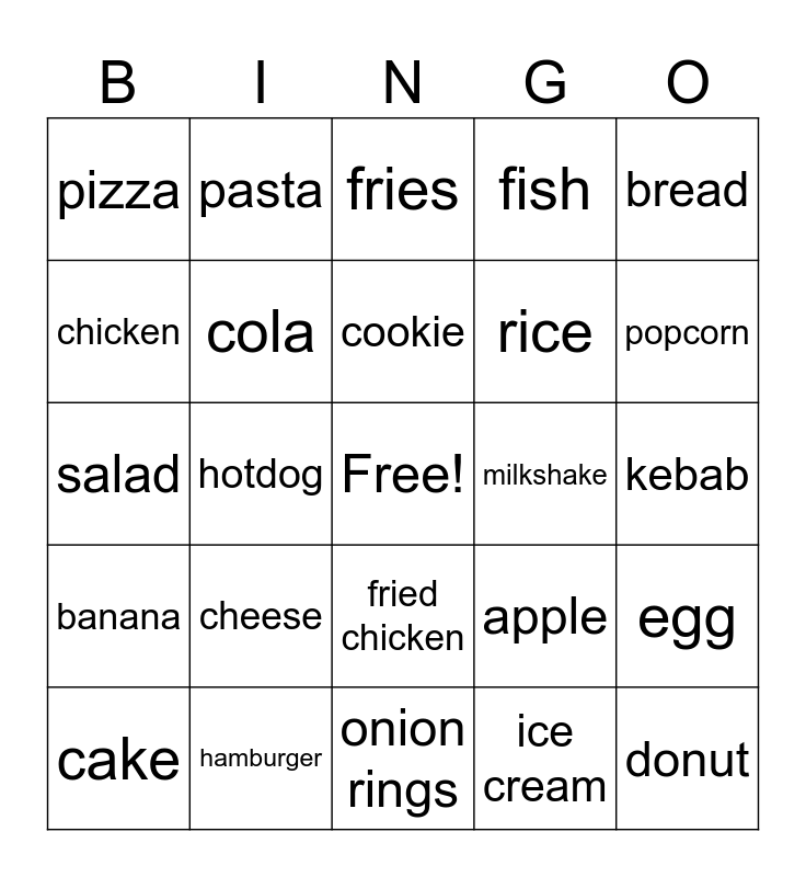 This bingo card has a free space and 30 words: hamburger, sandwich, hotdog, taco, pizza, fries, cola, fried chicken, milkshake, onion rings, kebab, donut, ice cream, muffin, popcorn, cotton candy, apple, banana, cheese, bread, salad, soup, pasta, rice, chicken, fish, egg, cake, cookie and yogurt.