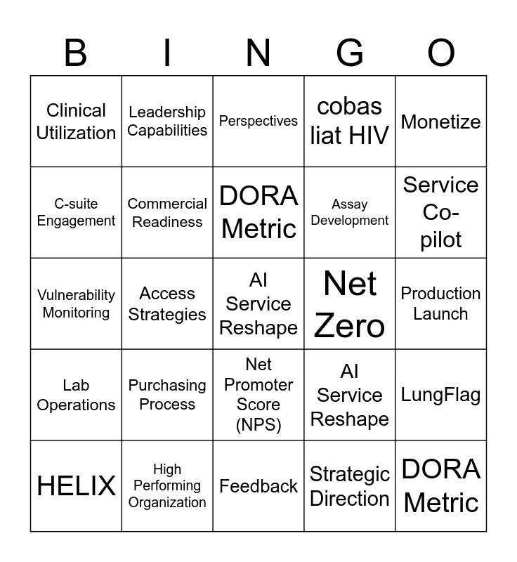 This bingo card has 240 words: GEOS Role Modeling Leadership Commitments EverydayAI High Performing Organization Inclusion Index Decision Making Strategic Direction Employee Engagement Career Opportunities Feedb, GEOS, Role Modeling, Leadership Commitments, EverydayAI, High Performing Organization, Inclusion Index, Decision Making, Strategic Direction, Employee Engagement, Career Opportunities, Free!, Feedback, Leadership Capabilities, Foundational Training, Benchmark, Diversity, Perspectives, Respect & Dignity, Continuous Learning, People Leaders, Self-Assessment, 2. Customer & Patient Centricity (20 Words), Patient Satisfaction, Net Promoter Score (NPS), Customer Experience (CX), Best in Class, Customer Support, Digital Products, Tangible Improvements, Key Accounts, Relationship Research, C-suite Engagement, Purchasing Process, Service Strategy, Instrument Connectivity, Proactive Service, ASAsphere, Pre-Configuration Centers, Time-to-install, AI Service Reshape, AI Chatbot, Service Co-pilot, 3. Product Excellence & Delivery (20 Words), Assay Development, Productivity, Time to Market, Milestone D, Software Product Development, DORA Metric, Cybersecurity, SBOM, Vulnerability Monitoring, GenMark, Period Costs, Product Line Stabilization, SmartGuide CGM, Manufacturing Readiness, AXELIOS, Performance Reliability, Production Launch, Reagent Stability, Supply Chain, Development Velocity, 4. Portfolio & Launch (20 Words), HELIX, cobas smart e, cobas sense, cobas liat HIV, RED Algorithms, Digital Biomarkers, Pilot-It, Elecsys NfL, pTau217, ApoE4p, IGRA TB, Mass Spec Solution, cobas MPXE, cobas HDV, Sequencing Solution, VENTANA BAP1, LungFlag, Launch Powerhouse, Cross-functional Readiness, Placement Target, 5. Digital Health & Innovation (20 Words), Monetize, Subscription Model, Recurring Revenue, Scale-it Phase, Total Contract Value, Clinical Decision Support (CDS), Digital Pathology (DP), Algo Suite, Reimbursement, Access Strategies, Lab Operations, Upgrade Time, Deployment, Sustainable Growth, Integrated RDS & RIS, Algo Clicks, Clinical Utilization, Commercialization, G-to-market Approach, Priority Markets, 6. Finance, Sustainability & Strategy (20 Words), Financial Targets, Sales Growth, Core Operating Profit, Free Cash Flow, Price Erosion, Net Zero, Scope 3, CO2 Reductions, Science-based Targets, Sustainability Data, Tender Success, Competitive Differentiators, Commercial Readiness, ASPIRE Roadmap, Business Disruptions, PHCS, R&D Operations, KSFs, KPIs, T0 Period, GEOS, Role Modeling, Leadership Commitments, EverydayAI, High Performing Organization, Inclusion Index, Decision Making, Strategic Direction, Employee Engagement, Career Opportunities, Feedback, Leadership Capabilities, Foundational Training, Benchmark, Diversity, Perspectives, Respect & Dignity, Continuous Learning, People Leaders, Self-Assessment, Patient Satisfaction, Net Promoter Score (NPS), Customer Experience (CX), Best in Class, Customer Support, Digital Products, Tangible Improvements, Key Accounts, Relationship Research, C-suite Engagement, Purchasing Process, Service Strategy, Instrument Connectivity, Proactive Service, ASAsphere, Pre-Configuration Centers, Time-to-install, AI Service Reshape, AI Chatbot, Service Co-pilot, Assay Development, Productivity, Time to Market, Milestone D, Software Product Development, DORA Metric, Cybersecurity, SBOM, Vulnerability Monitoring, GenMark, Period Costs, Product Line Stabilization, SmartGuide CGM, Manufacturing Readiness, AXELIOS, Performance Reliability, Production Launch, Reagent Stability, Supply Chain, Development Velocity, cobas smart e, cobas sense, cobas liat HIV, RED Algorithms, Digital Biomarkers, Pilot-It, Elecsys NfL, Mass Spec Solution, cobas MPXE, cobas HDV, Sequencing Solution, VENTANA BAP1, LungFlag, Launch Powerhouse, Cross-functional Readiness, Placement Target, Monetize, Subscription Model, Recurring Revenue, Scale-it Phase, Total Contract Value, Clinical Decision Support (CDS), Digital Pathology (DP), Algo Suite, Reimbursement, Access Strategies, Lab Operations, Upgrade Time, Deployment, Sustainable Growth, Integrated RDS & RIS, Algo, Clinical Utilization, Commercialization, G-to-market Approach, Priority Markets, Financial Targets, Sales Growth, Core Operating Profit, Cash Flow, Price Erosion, Net Zero, CO2 Reductions, Science-based Targets, Sustainability, Tender, Competitive Differentiators, Commercial Readiness, ASPIRE, Business Disruptions, R&D Operations, KPIs and LumiraDX.