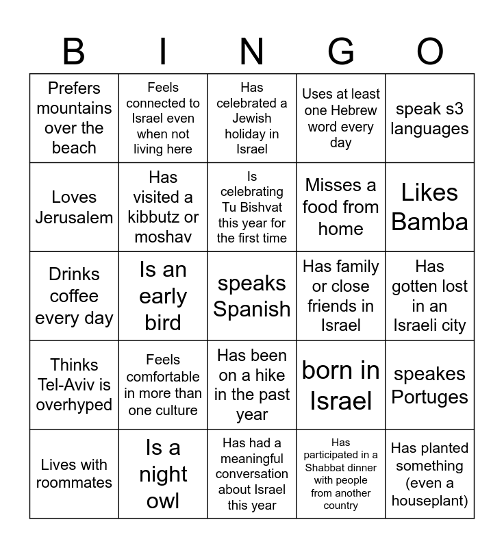 This bingo card has 25 words: Feels comfortable in more than one culture, Has had a meaningful conversation about Israel this year, Is celebrating Tu Bishvat this year for the first time, Lives with roommates, speak s3 languages, Prefers mountains over the beach, Loves Jerusalem, Feels connected to Israel even when not living here, Has family or close friends in Israel, Has been on a hike in the past year, Misses a food from home, Drinks coffee every day, born in Israel, speakes Portuges, Has visited a kibbutz or moshav, Has planted something (even a houseplant), Has gotten lost in an Israeli city, Has celebrated a Jewish holiday in Israel, Likes Bamba, Is an early bird, speaks Spanish, Is a night owl, Thinks Tel-Aviv is overhyped, Uses at least one Hebrew word every day and Has participated in a Shabbat dinner with people from another country.