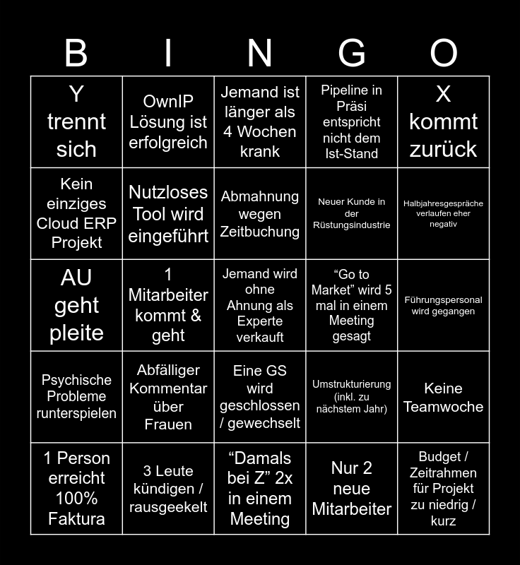 This bingo card has a free space and 24 words: Abfälliger Kommentar über Frauen, 3 Leute kündigen / rausgeekelt, Abmahnung wegen Zeitbuchung, 1 Person erreicht 100% Faktura, X kommt zurück, Y trennt sich, Kein einziges Cloud ERP Projekt, OwnIP Lösung ist erfolgreich, “Go to Market” wird 5 mal in einem Meeting gesagt, Eine GS wird geschlossen / gewechselt, Neuer Kunde in der Rüstungsindustrie, AU geht pleite, Umstrukturierung (inkl. zu nächstem Jahr), Keine Teamwoche, Nutzloses Tool wird eingeführt, Nur 2 neue Mitarbeiter, Führungspersonal wird gegangen, Jemand ist länger als 4 Wochen krank, Halbjahresgespräche verlaufen eher negativ, 1 Mitarbeiter kommt & geht, Budget / Zeitrahmen für Projekt zu niedrig / kurz, Psychische Probleme runterspielen, Pipeline in Präsi entspricht nicht dem Ist-Stand and “Damals bei Z” 2x in einem Meeting.