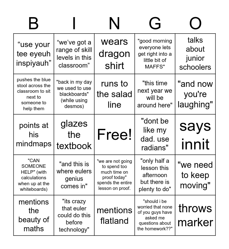 This bingo card has a free space and 24 words: "and this is where eulers genius comes in", "its crazy that euler could do this before technology", runs to the salad line, mentions the beauty of maths, talks about junior schoolers, “use your tee eyeuh inspiyauh”, pushes the blue stool across the classroom to sit next to someone to help them, “we’ve got a range of skill levels in this classroom”, "dont be like my dad. use radians", "we are not going to spend too much time on proof today" spends the entire lesson on proof., "this time next year we will be around here", points at his mindmaps, "only half a lesson this afternoon but there is plenty to do", "we need to keep moving", "back in my day we used to use blackboards" (while using desmos), "should i be worried that none of you guys have asked me questions about the homework??", says innit, wears dragon shirt, "and now you're laughing", glazes the textbook, throws marker, "CAN SOMEONE HELP" (with calculations when up at the whiteboards), "good morning everyone lets get right into a little bit of MAFFS" and mentions flatland.