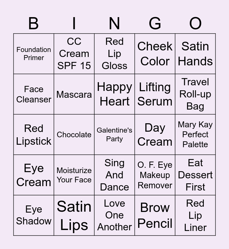 This bingo card has a free space and 24 words: Moisturize Your Face, Satin Lips, Happy Heart, Eye Shadow, Satin Hands, Foundation Primer, Face Cleanser, CC Cream SPF 15, Day Cream, Sing And Dance, Lifting Serum, Red Lipstick, O. F. Eye Makeup Remover, Eat Dessert First, Mascara, Brow Pencil, Mary Kay Perfect Palette, Red Lip Gloss, Travel Roll-up Bag, Chocolate, Red Lip Liner, Eye Cream, Cheek Color and Love One Another.