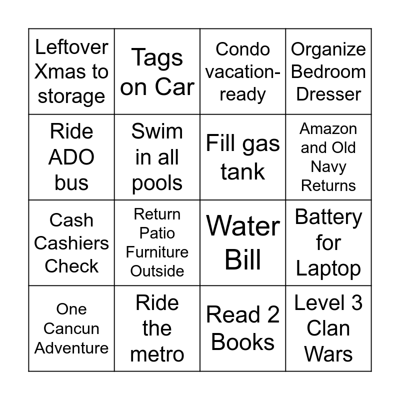 This bingo card has 16 words: Ride the metro, Battery for Laptop, Condo vacation-ready, Leftover Xmas to storage, Cash Cashiers Check, Tags on Car, Water Bill, Read 2 Books, Ride ADO bus, Swim in all pools, One Cancun Adventure, Organize Bedroom Dresser, Return Patio Furniture Outside, Amazon and Old Navy Returns, Fill gas tank and Level 3 Clan Wars.