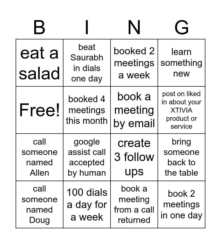 This bingo card has 16 words: 100 dials a day for a week, bring someone back to the table, booked 2 meetings a week, eat a salad, call someone named Allen, beat Saurabh in dials one day, create 3 follow ups, book a meeting from a call returned, Free!, booked 4 meetings this month, call someone named Doug, learn something new, google assist call accepted by human, post on liked in about your XTIVIA product or service, book a meeting by email and book 2 meetings in one day.