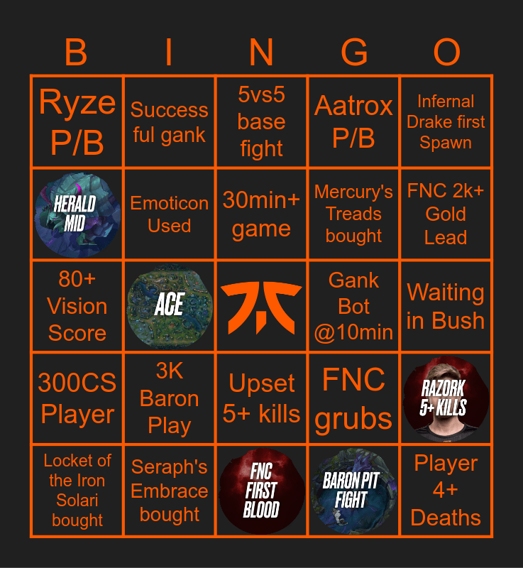 This bingo card has 5 images, a free space and 19 words: Locket of the Iron Solari bought, 3K Baron Play, 30min+ game, Infernal Drake first Spawn, Ryze P/B, Success ful gank, 5vs5 base fight, Gank Bot @10min, Waiting in Bush, 80+ Vision Score, Emoticon Used, FNC grubs, Seraph's Embrace bought, Aatrox P/B, FNC 2k+ Gold Lead, 300CS Player, Upset 5+ kills, Mercury's Treads bought and Player 4+ Deaths.