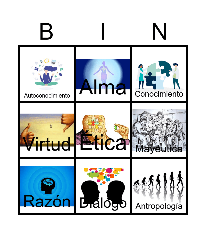 This bingo card has 12 images and 12 words: Sócrates, Antropología, Ética, Mayéutica, Alma, Conocimiento, Diálogo, Foro, Autoconocimiento, Virtud, Razón and Sabiduría.