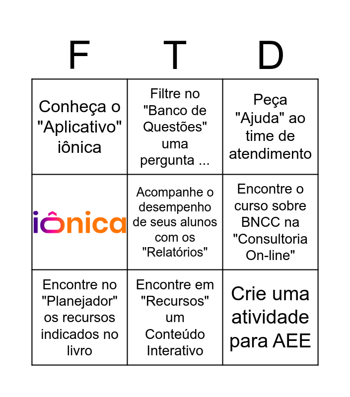 This bingo card has 1 images and 13 words: Explore os submenus da "Biblioteca", Conheça a IA da iônica, Encontre no "Planejador" os recursos indicados no livro, Filtre no "Banco de Questões" uma pergunta ..., Acompanhe o desempenho de seus alunos com os "Relatórios", Crie uma atividade para AEE, "Favorite" um livro, Encontre em "Recursos" um Conteúdo Interativo, Conheça o "Aplicativo" iônica, Acesse o "Guia para Inclusão", Encontre o curso sobre BNCC na "Consultoria On-line", Peça "Ajuda" ao time de atendimento and Organize o Plano de Aula de "Cursos".