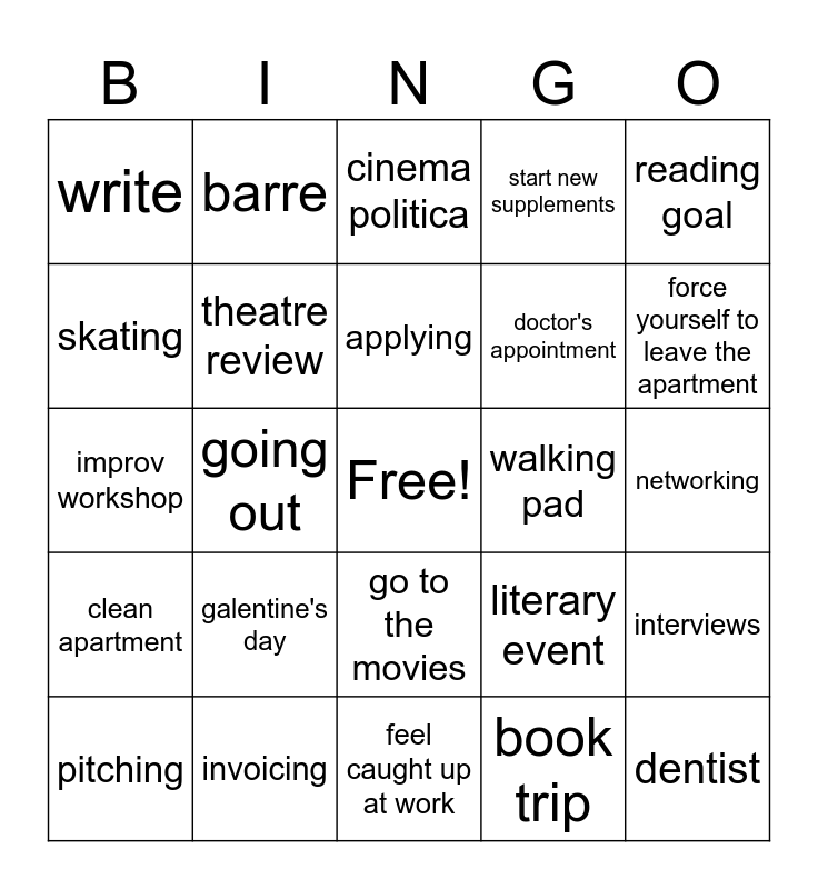 This bingo card has a free space and 24 words: galentine's day, invoicing, applying, pitching, reading goal, write, skating, barre, walking pad, go to the movies, doctor's appointment, improv workshop, literary event, interviews, theatre review, book trip, networking, cinema politica, force yourself to leave the apartment, going out, dentist, clean apartment, start new supplements and feel caught up at work.