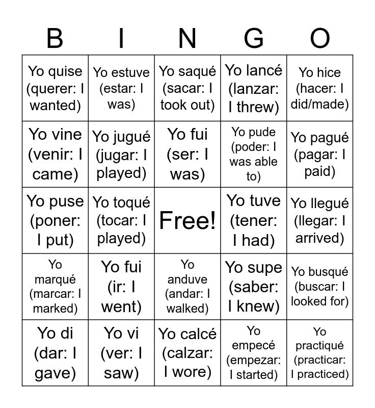 This bingo card has a free space and 24 words: Yo fui (ir: I went), Yo vi (ver: I saw), Yo fui (ser: I was), Yo di (dar: I gave), Yo hice (hacer: I did/made), Yo quise (querer: I wanted), Yo vine (venir: I came), Yo estuve (estar: I was), Yo tuve (tener: I had), Yo anduve (andar: I walked), Yo pude (poder: I was able to), Yo puse (poner: I put), Yo supe (saber: I knew), Yo busqué (buscar: I looked for), Yo jugué (jugar: I played), Yo empecé (empezar: I started), Yo llegué (llegar: I arrived), Yo saqué (sacar: I took out), Yo pagué (pagar: I paid), Yo toqué (tocar: I played), Yo practiqué (practicar: I practiced), Yo marqué (marcar: I marked), Yo lancé (lanzar: I threw) and Yo calcé (calzar: I wore).