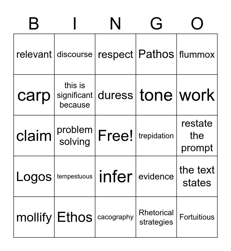 This bingo card has a free space and 25 words: tempestuous, cacography, duress, mollify, flummox, relevant, carp, discourse, trepidation, infer, tone, claim, evidence, the text states, this is significant because, reasoning, restate the prompt, respect, work, problem solving, Fortuitious, Ethos, Logos, Pathos and Rhetorical strategies.