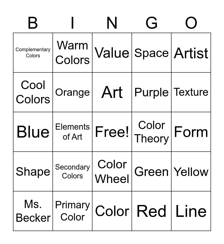 This bingo card has a free space and 24 words: Secondary Colors, Primary Color, Art, Ms. Becker, Artist, Complementary Colors, Cool Colors, Warm Colors, Color Theory, Color Wheel, Purple, Blue, Green, Yellow, Orange, Red, Form, Value, Texture, Elements of Art, Line, Shape, Space and Color.