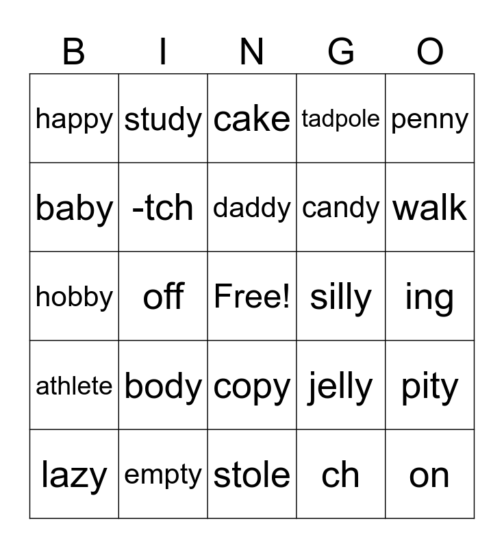 This bingo card has a free space and 24 words: body, empty, daddy, lazy, penny, happy, baby, study, silly, copy, candy, hobby, jelly, pity, -tch, ch, ing, cake, walk, off, on, athlete, tadpole and stole.