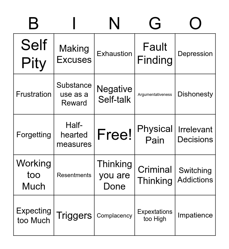 This bingo card has a free space and 24 words: Resentments, Triggers, Negative Self-talk, Expecting too Much, Depression, Self Pity, Frustration, Making Excuses, Physical Pain, Thinking you are Done, Argumentativeness, Forgetting, Criminal Thinking, Switching Addictions, Substance use as a Reward, Expextations too High, Irrelevant Decisions, Exhaustion, Dishonesty, Half-hearted measures, Impatience, Working too Much, Fault Finding and Complacency.