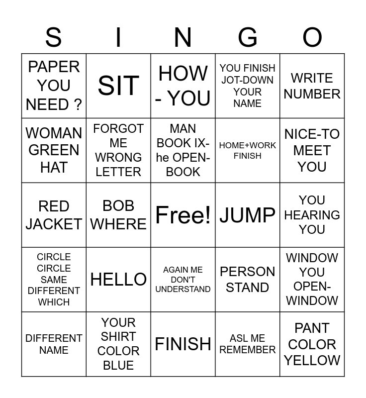 This bingo card has a free space and 24 words: HELLO, YOUR SHIRT COLOR BLUE, MAN BOOK IX-he OPEN-BOOK, DIFFERENT NAME, WRITE NUMBER, PAPER YOU NEED ?, WOMAN GREEN HAT, SIT, JUMP, AGAIN ME DON'T UNDERSTAND, HOME+WORK FINISH, RED JACKET, PERSON STAND, WINDOW YOU OPEN-WINDOW, FORGOT ME WRONG LETTER, ASL ME REMEMBER, YOU HEARING YOU, HOW - YOU, NICE-TO MEET YOU, BOB WHERE, PANT COLOR YELLOW, CIRCLE CIRCLE SAME DIFFERENT WHICH, YOU FINISH JOT-DOWN YOUR NAME and FINISH.