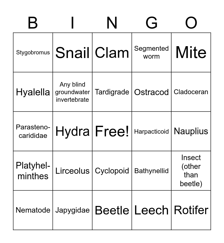 This bingo card has a free space and 24 words: Lirceolus, Japygidae, Tardigrade, Nematode, Mite, Stygobromus, Hyalella, Snail, Harpacticoid, Cyclopoid, Ostracod, Parasteno-carididae, Bathynellid, Insect (other than beetle), Any blind groundwater invertebrate, Leech, Nauplius, Clam, Cladoceran, Hydra, Rotifer, Platyhel-minthes, Segmented worm and Beetle.