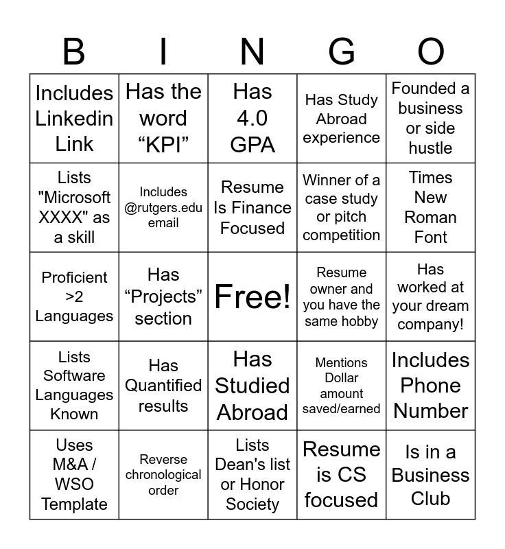 This bingo card has a free space and 24 words: Has Quantified results, Reverse chronological order, Resume Is Finance Focused, Uses M&A / WSO Template, Founded a business or side hustle, Includes Linkedin Link, Lists "Microsoft XXXX" as a skill, Has the word “KPI”, Resume owner and you have the same hobby, Has Studied Abroad, Winner of a case study or pitch competition, Proficient >2 Languages, Mentions Dollar amount saved/earned, Includes Phone Number, Includes @rutgers.edu email, Resume is CS focused, Has worked at your dream company!, Has 4.0 GPA, Times New Roman Font, Has “Projects” section, Is in a Business Club, Lists Software Languages Known, Has Study Abroad experience and Lists Dean's list or Honor Society.