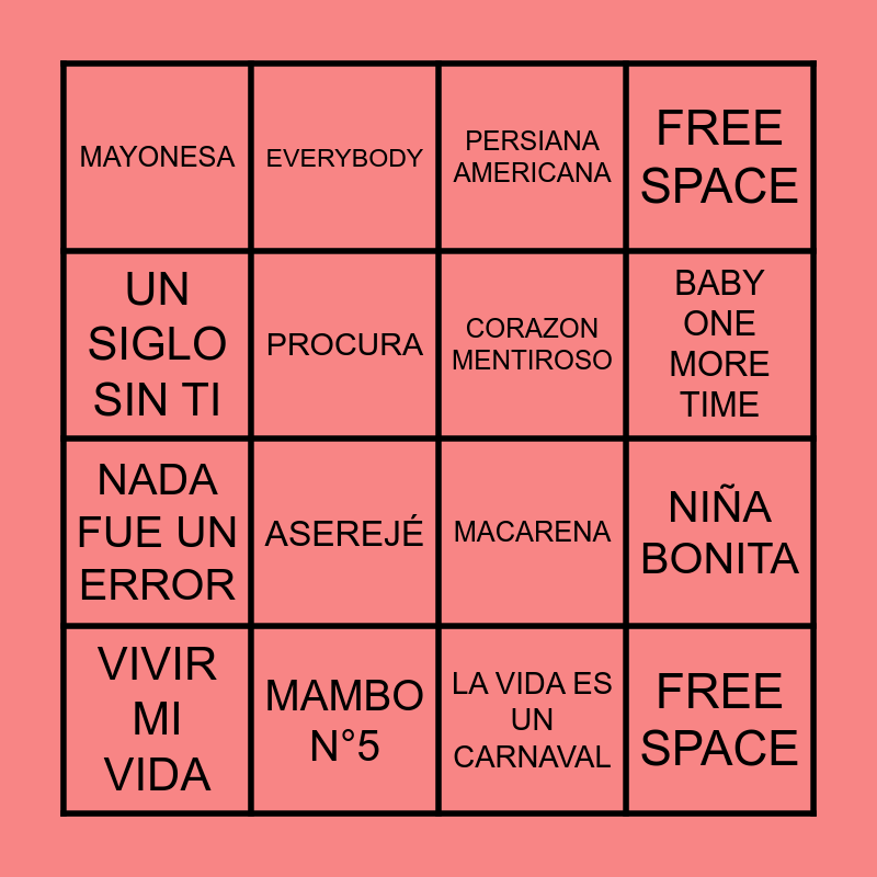 This bingo card has 7 images and 57 words: MI PRIMER MILLON, CARALUNA, EVERYBODY, I GOTTA FEELING, BABY ONE MORE TIME, ATREVETE TE TE, COLGANDO EN TUS MANOS, LA BICICLETA, LA VIDA ES UN CARNAVAL, UN SIGLO SIN TI, PROVOCAME, PROCURA, NIÑA BONITA, MAYONESA, THE RHYTHM OF THE NIGHT, NADA FUE UN ERROR, FREE SPACE, FREE SPACE, FREE SPACE, LLOVIEDO ESTRELLAS, GIRLS JUST WANT TO HAVE FUN, GASOLINA, LO QUE PASÓ, PASÓ, ELLA ME LEVANTÓ, LLAMADO DE EMERGENCIA, LA QUIERO A MORIR, MENEAITO, LA GOZADERA, NO ME ARREPIENTO DE ESTE AMOR, TODOS ME MIRAN, ASEREJÉ, ME VOY, LIMON Y SAL, LAMBADA, CON LA MISMA MONEDA, CORAZON MENTIROSO, MACARENA, MAMBO N°5, AHORA TE PUEDES MARCHAR, CUANDO CALIENTA EL SOL, ME GUSTAS TU, VIVIR MI VIDA, DON, MENTIROSA, LA MORDIDITA, LIVIN´LA VIDA LOCA, AMOR CLASIFICADO, LO MEJOR DEL AMOR, DESPECHÁ, CIEGA, SORDOMUDA, LA TORTURA, LOBA, PERSIANA AMERICANA, TREN DEL CIELO, CIUDAD MAGICA, ONDA ONDA and YMCA.