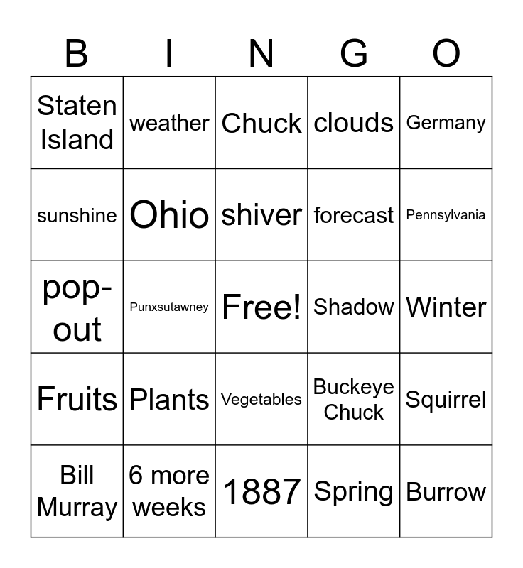This bingo card has a free space and 31 words: 1887, Phil, Punxsutawney, February 2, Staten Island, Chuck, Ohio, Buckeye Chuck, Shadow, Spring, Winter, Burrow, Hibernate, German Candlemas, Pennsylvania, Marmota Monax, Squirrel, Plants, Fruits, Vegetables, Germany, Scroll, Bill Murray, weather, forecast, sunshine, clouds, pop-out, 6 more weeks, shiver and cold.