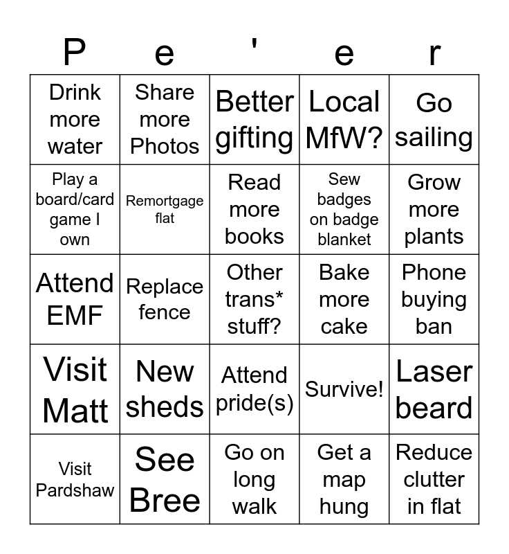 This bingo card has 25 words: New sheds, Go on long walk, Read more books, Visit Pardshaw, Go sailing, Drink more water, Play a board/card game I own, Share more Photos, Bake more cake, Attend pride(s), Sew badges on badge blanket, Attend EMF, Survive!, Laser beard, Remortgage flat, Reduce clutter in flat, Phone buying ban, Better gifting, Grow more plants, Replace fence, Other trans* stuff?, See Bree, Visit Matt, Local MfW? and Get a map hung.
