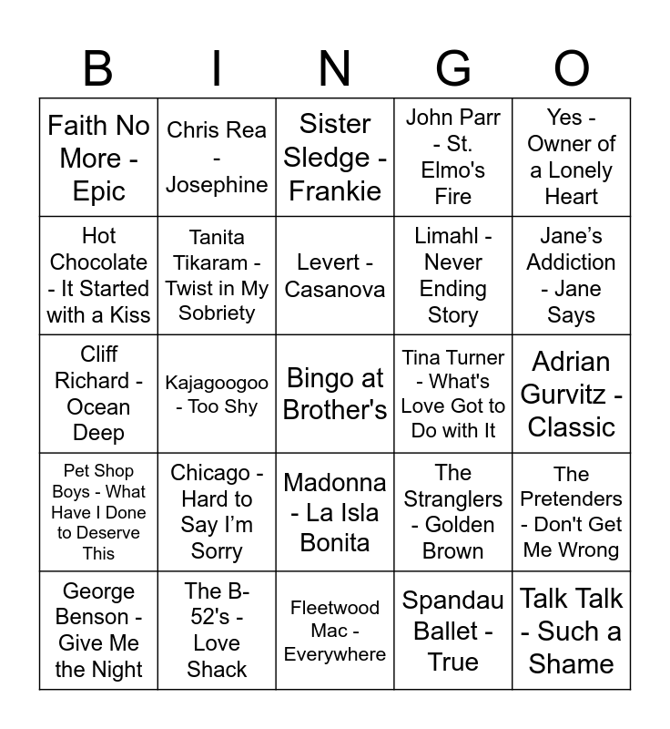 This bingo card has a free space and 98 words: A-Ha - Take On Me, A-Ha - The Living Daylights, AL B. SURE! - Nite and Day, Adrian Gurvitz - Classic, Al Jarreau - Mornin', Alannah Myles - Black Velvet, Alphaville - Big in Japan, Alphaville - Forever Young, Art Of Noise - Kiss, Belouis Some - Imagination, Bette Midler - Wind Beneath My Wings, Chaka Khan - Ain't Nobody, Chaka Khan - I Feel for You, Chicago - Hard to Say I’m Sorry, Chicago - You're the Inspiration, Chris Rea - Josephine, Cliff Richard - Ocean Deep, Climie Fisher - Love Changes, Debbie Gibson - Lost in Your Eyes, Dexys - Geno, Donald Fagen - I.G.Y., Duran Duran - Girls on Film, Duran Duran - Hungry like the Wolf, Dusty Springfield - In Private, Echo And The Bunnymen - The Killing Moon, Faith No More - Epic, Fleetwood Mac - Everywhere, Fleetwood Mac - Little Lies, Foreigner - I Want to Know What Love Is, Foreigner - Waiting for a Girl Like You, George Benson - Give Me the Night, Hot Chocolate - It Started with a Kiss, James Ingram - There’s No Easy Way, Jane Child - Don’t Wanna Fall in Love, Jane’s Addiction - Jane Says, Joey Scarbury - Believe It or Not, John Parr - St. Elmo's Fire, Joy Division - Love Will Tear Us Apart, Kajagoogoo - Too Shy, Karyn White - Superwoman, Larry Graham - One in a Million You, Levert - Casanova, Limahl - Never Ending Story, London Boys - I'm Gonna Give My Heart, Los Lobos - La Bamba, Madonna - La Isla Bonita, Madonna - Like a Prayer, Marillion - Kayleigh, Michael McDonald - I Keep Forgettin, Narada Michael Walden - Gimme Gimme Gimme, New Order - Blue Monday '88, Nu Shooz - I Can’t Wait, Peabo Bryson - If Ever You're in My Arms Again, Peter Cetera - Glory of Love, Peter Schilling - Major Tom, Pet Shop Boys - Always on My Mind, Pet Shop Boys - What Have I Done to Deserve This, Ramones - Baby, I Love You, Randy Crawford - You Might Need Somebody, Richie Havens - Going Back to My Roots, Robert Palmer - Simply Irresistible, Roberta Flack - Back Together Again, Rod Stewart - Baby Jane, Rod Stewart - Young Turks, Roger - I Want to Be Your Man, Roxette - Dressed for Success, Roxette - The Look, Sheila E. - The Glamorous Life, Simply Red - Holding Back the Years, Simply Red - Money's Too Tight, Sister Sledge - Frankie, Spandau Ballet - Gold, Spandau Ballet - True, Stacy Lattisaw - Perfect Combination, Starpoint - Object of My Desire, Starship - Nothing's Gonna Stop Us Now, Starship - We Built This City, Stevie Nicks - Edge of Seventeen, Talk Talk - It's My Life, Talk Talk - Such a Shame, Talking Heads - This Must Be the Place, Tanita Tikaram - Twist in My Sobriety, The B-52's - Love Shack, The Beach Boys - Kokomo, The Blues Brothers - Everybody Needs Somebody to Love, The Cars - Drive, The Dream Academy - Life in a Northern Town, The Pretenders - Back on the Chain Gang, The Pretenders - Don't Get Me Wrong, The Proclaimers - I'm Gonna Be (500 Miles), The Smiths - How Soon Is Now, The Stranglers - Golden Brown, The Time - Jungle Love, Tina Turner - We Don't Need Another Hero, Tina Turner - What's Love Got to Do with It, Twisted Sister - We’re Not Gonna Take It, Yes - Owner of a Lonely Heart and Zapp - More Bounce to the Ounce.