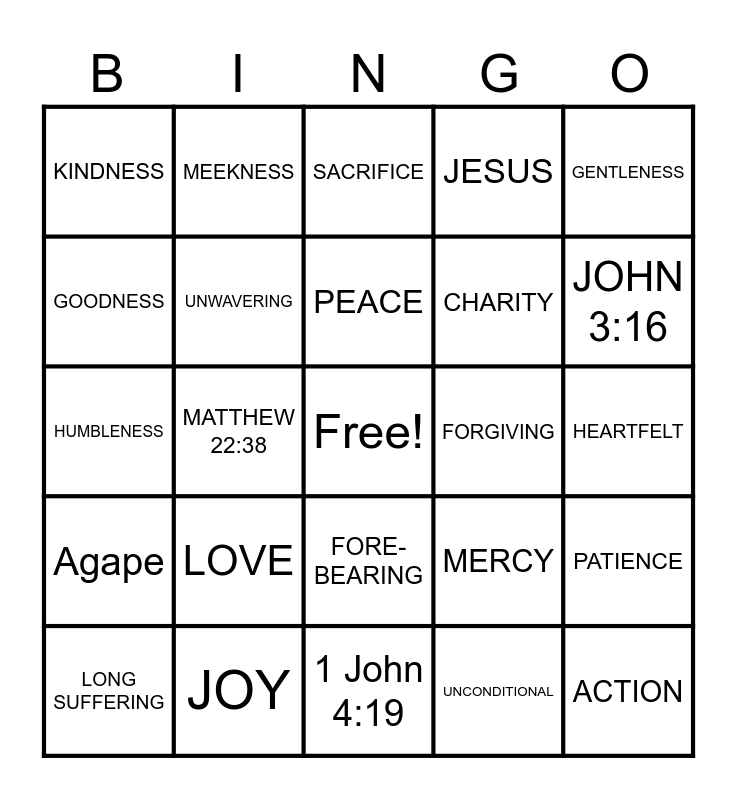 This bingo card has a free space and 24 words: LOVE, JOY, PEACE, LONG SUFFERING, GENTLENESS, KINDNESS, GOODNESS, MEEKNESS, FORGIVING, FORE- BEARING, CHARITY, HUMBLENESS, MERCY, PATIENCE, UNWAVERING, UNCONDITIONAL, HEARTFELT, SACRIFICE, JOHN 3:16, MATTHEW 22:38, ACTION, Agape, JESUS and 1 John 4:19.