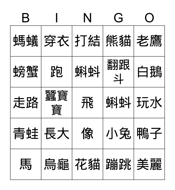 This bingo card has a free space and 24 words: 長大, 烏龜, 蝌蚪, 馬, 老鷹, 螞蟻, 螃蟹, 穿衣, 蝌蚪, 像, 翻跟斗, 走路, 小兔, 鴨子, 跑, 蹦跳, 玩水, 打結, 白鵝, 蠶寶寶, 美麗, 青蛙, 熊貓 and 花貓.